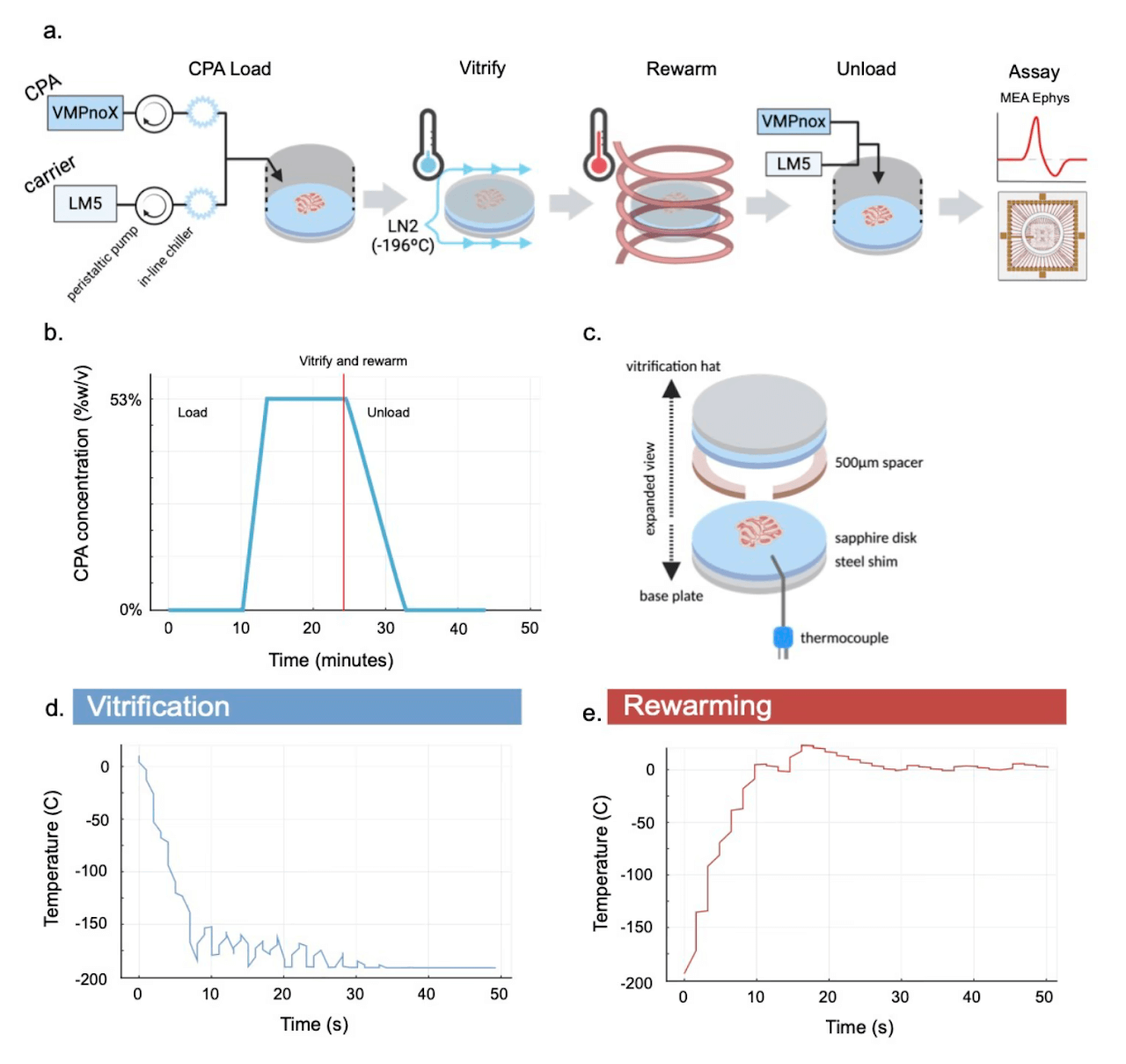 Figure 1. Tissue Slice Cyropreservation Protocol. a) System Overview. Acute neural tissue is loaded with VPMnoX cryoprotectant (53% w/v cryoprotectants) before vitrification and rewarming using a specialized chamber. Activity is then recorded on a multielectrode array. b) CPA concentration as a function of time duriong cryoprotectant loading and unloading. c) Vitrification and magnetic rewarming. d) Cooling profile from the slice presented in Fig 2. e) Rewarming profile from the slice presented in Fig 2.
