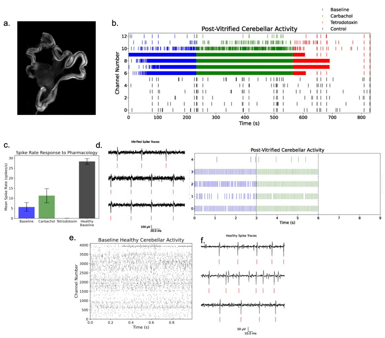 Figure 2. MEA Electrical Activity from Vitrified Slice. a) DAPI staining showing example morphology of a rat cerebellar slice after cryopreservation. b) Raster plot from a multi-electrode array recording of a vitrified and rewarmed cerebellar slice. Color changes indicate onset of pharmacology, and black signifies a region of electrodes not in contact with tissue to track global noise. Zoomed panel shows excerpts from highly active channels (6-10) for visual clarity. c) Mean firing rate for active areas in the same vitrified cerebellum slice as in (b), separated by pharmacology condition. Mean firing rate data from a separate healthy control slice is shown in gray. d) Representative raw signal traces from the same vitrified cerebellar slice as in (b) and (c). Red lines denote detected spikes. e) A representative raster plot showing high spiking activity from a healthy cerebellar slice being perfused with aCSF. Note time axis compared to (b). f) Same as (d), but for a healthy cerebellar slice.