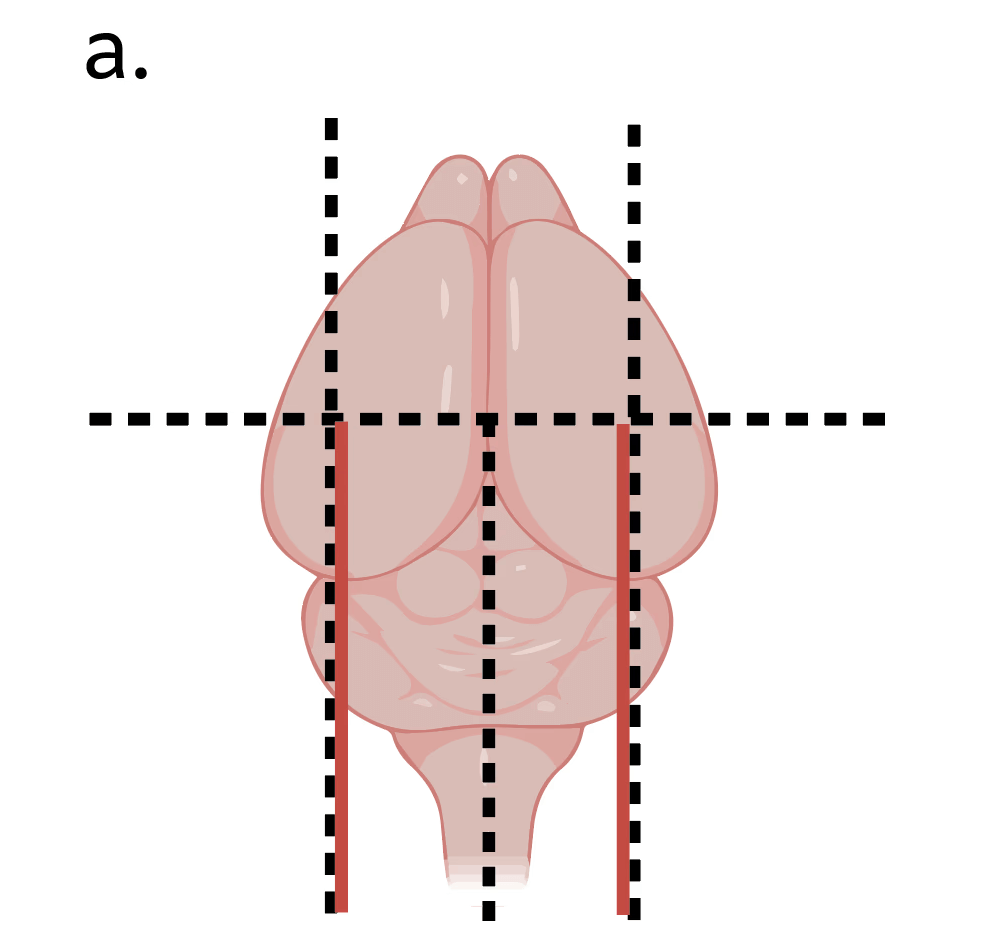 Figure 3a. Cerebellar Acute Slice Preparation. Scheme for blunt dissection with a razor blade (black dashed lines) and glueing to the slicing platform (red lines) to produce sagittal slices on vibratome.